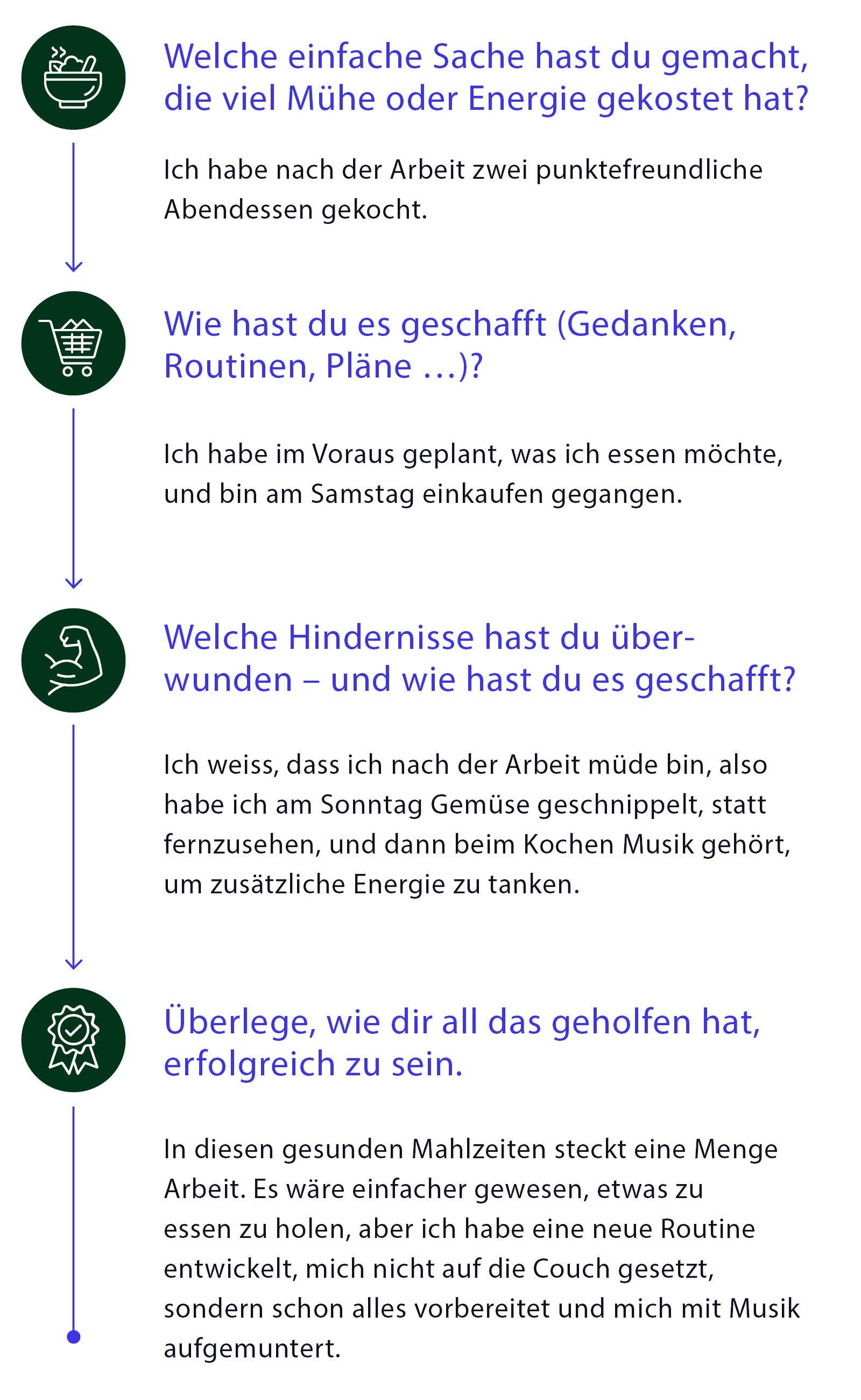 Es mag sich erstmal komisch anfühlen, dir selbst auf die Schulter zu klopfen. Doch es geht nicht darum, zu prahlen. Du registrierst, was funktioniert und, was noch wichtiger ist, warum es funktioniert. Und gerade das ist besonders relevant für deinen Weg zum Wunschgewicht. Und das kann dir helfen, weiterzumachen – mit der Suche nach punktefreundlichen Rezepten in der App, mit dem nächsten Training, mit einer normalen Schlafenszeit ... bis hin zum Erreichen deiner grösseren Ziele.