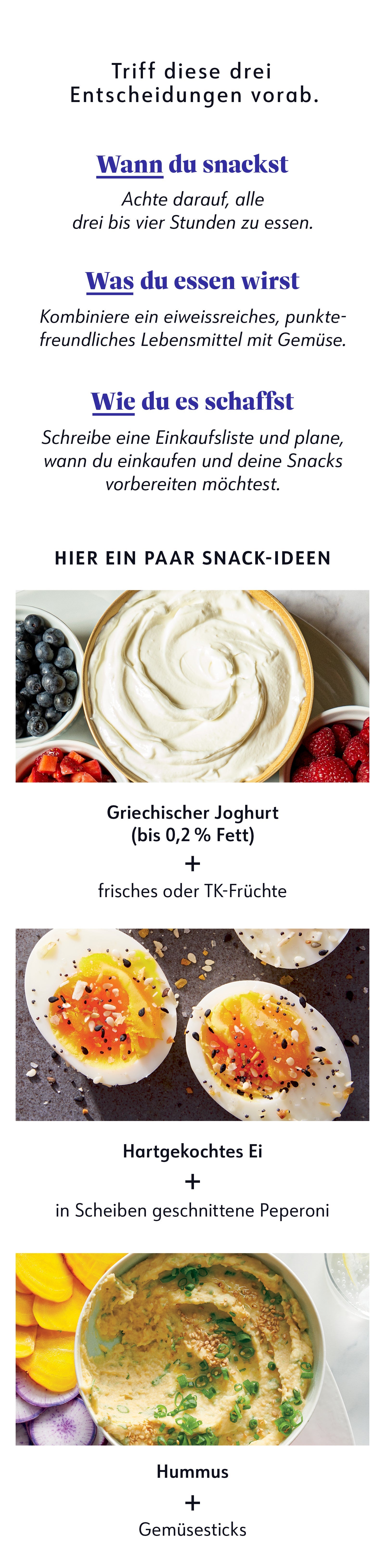 Stell dir vor: Es ist drei Uhr nachmittags, dein Magen knurrt. Das Abendessen ist noch eine Weile hin und du hast nur noch wenige Points® für den Rest des Tages übrig. Greifst du nach dem Erstbesten, was dir vor die Nase kommt? Nein – denn du hast die 3 Schritte dieses Snack-Leitfadens im Kopf.