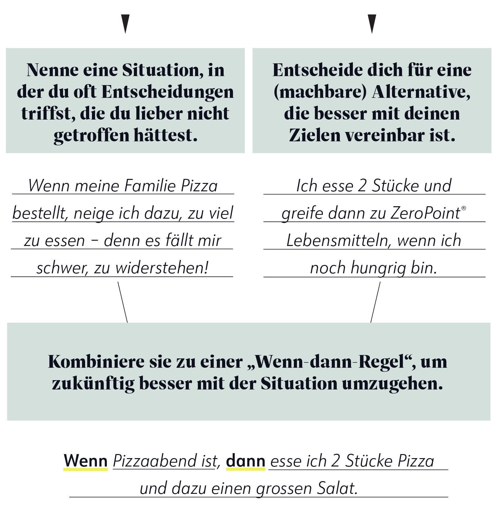 Wie gelingt es besser? Indem du „Wenn-dann-Regeln“ für dich festlegst und dadurch schon im Voraus entscheidest, wie du mit schwierigen Situationen umgehen möchtest. So gerätst du in der Situation selbst nicht ins Wanken und ziehst dein Vorhaben eher durch. Wichtig ist, dass dein „Dann“ wirklich machbar und darauf ausgerichtet ist, was du wirklich tun möchtest. (Und nicht darauf, was du nicht tun möchtest.) Ein Beispiel, wie du es schaffst: Für immer auf einen Pizzaabend zu verzichten, macht keinen Spass. Eine bessere Strategie ist: 2 Stücke Pizza zu essen – und dann einen Plan zu haben, was du machst, wenn du immer noch hungrig bist, z. B. einen grossen Salat dazu zu essen.