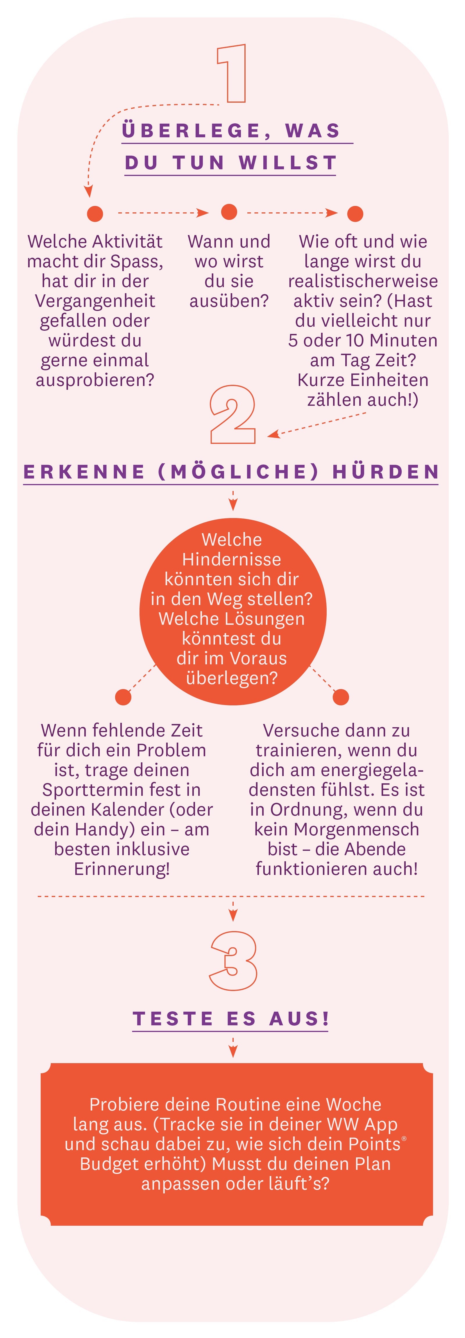 Möchtest du Bewegung zur Routine machen und langfristig beibehalten? Nutze die folgenden Schritte, um einen Plan zu erstellen.