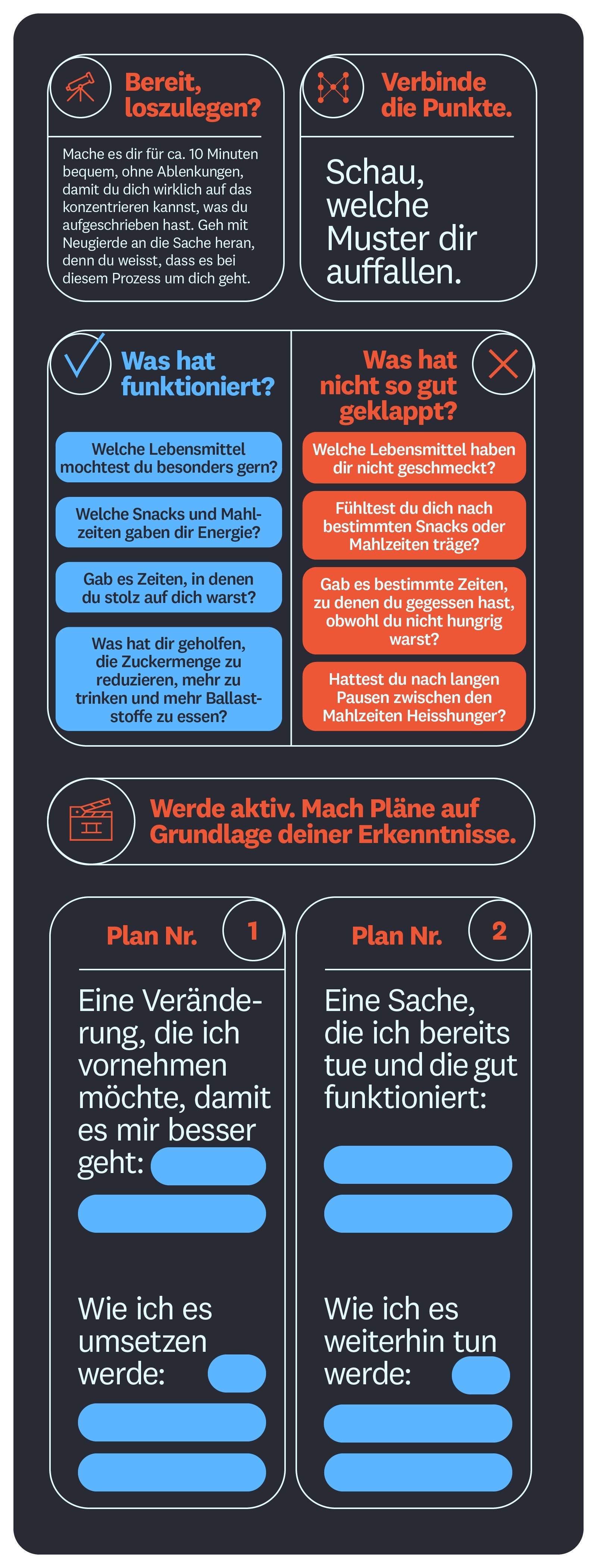 Denk daran: Das ideale Essverhalten für dich ist eines, das du beibehalten kannst – und das sieht für jeden anders aus! Im ersten Schritt ist es dabei wichtig, dir bewusst zu werden, was für ein Essverhalten du hast, und zu schauen, welche Muster bei dir funktionieren und welche nicht. Im zweiten Schritt schaust du, wie du diese Informationen für dich nutzen kannst, und überlegst dir, welche neuen Strategien du ausprobieren wirst, um sicherzustellen, dass dein Plan für dich wirklich umsetzbar ist.