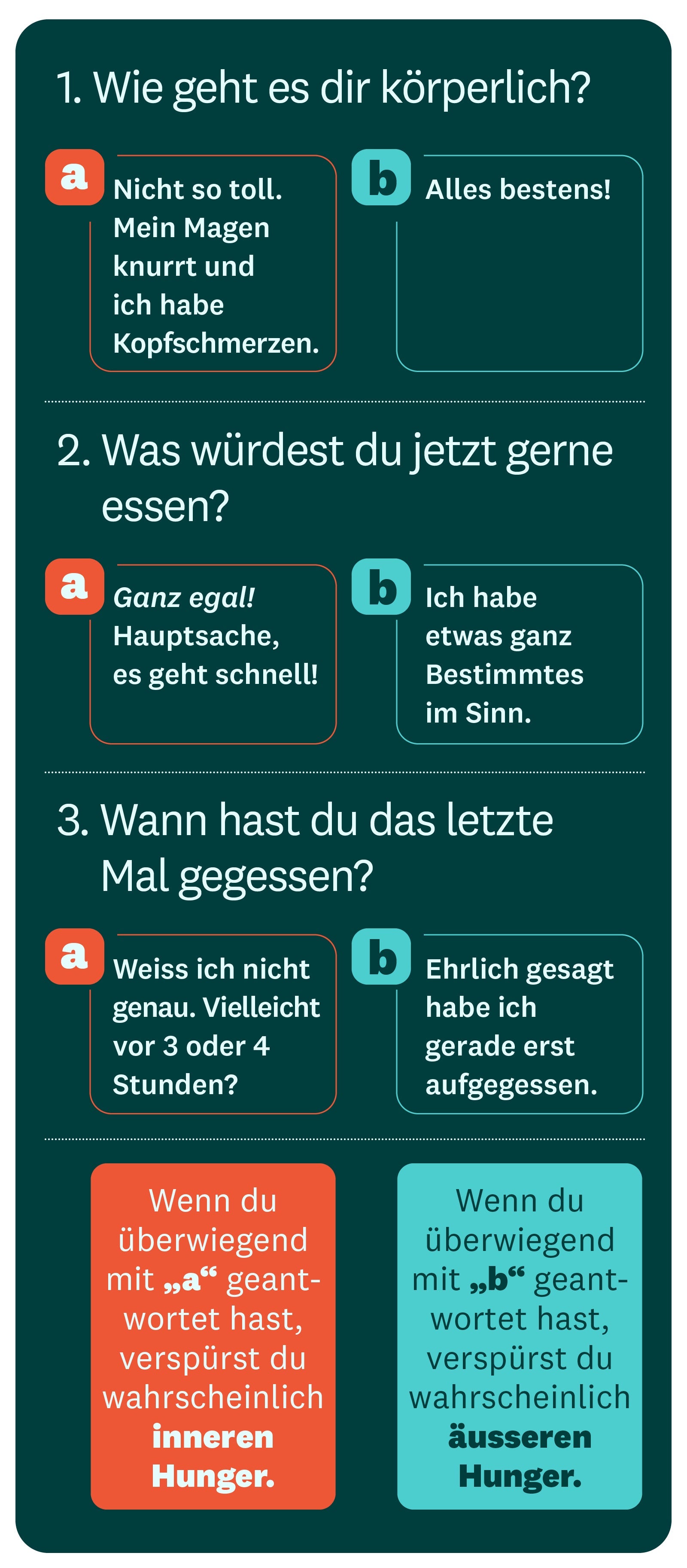 Wir unterscheiden zwei Arten von Hunger: den inneren bzw. körperlichen Hunger und den äusseren Hunger, wie z. B. den Lust-Hunger oder den Hunger aus emotionalen Gründen.