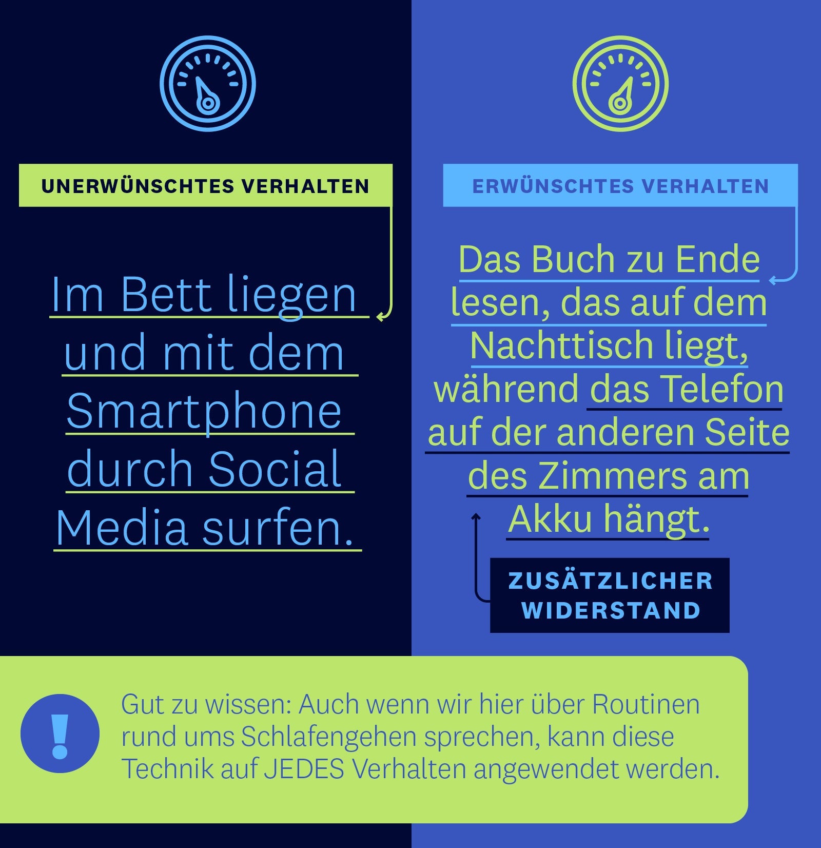 Wir haben den Widerstand erhöht, um dir das Verhalten, das du nicht zeigen willst – z. B. dich von Insta, Facebook oder TikTok in den Bann ziehen zu lassen –, schwerer zu machen, weil es jetzt mehr Energie erfordert. Plötzlich erscheint das erwünschte Verhalten, in diesem Fall ein Buch zu lesen, viel attraktiver – und schon bald wird diese gesündere Wahl deine erste Wahl sein.