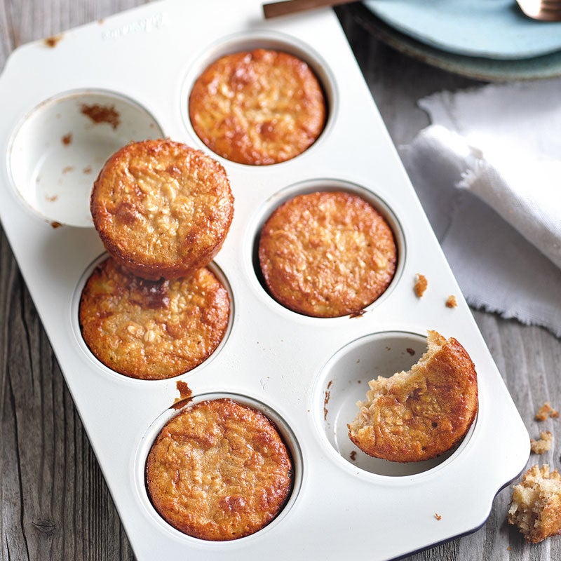 Teig in 12 Silikon-Muffinförmchen füllen und im Backofen auf mittlerer Schiene ca. 35 Minuten backen. Apfel-Bananen-Muffins servieren.