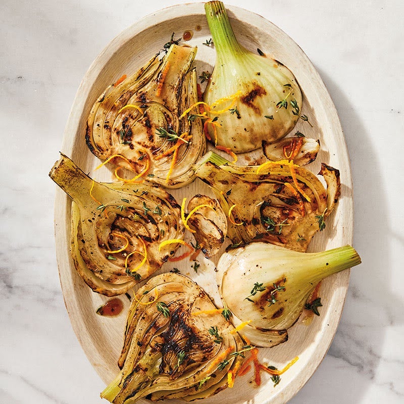 Fenchel abtropfen lassen, Marinade dabei auffangen, und in einer Grillschale bei direkter Hitze 10–15 Minuten grillen. Fenchel mit Marinade beträufeln, mit Orangenschale und Thymian vermischen und servieren.