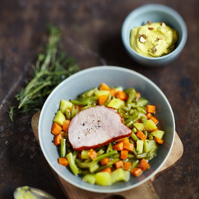 Haselnüsse fettfrei rösten und mit Senf verrühren und zum Eintopf servieren.