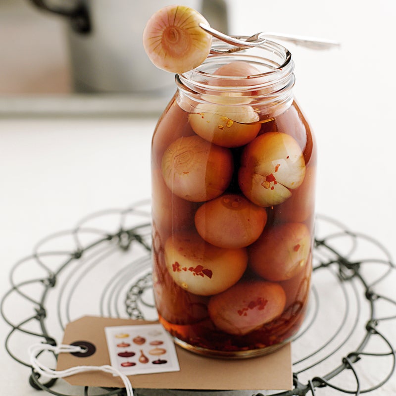 Schalotten pellen und Ober- und Unterseiten entfernen. Schalotten auf 2 sterilisierte 1-Liter-Gläser verteilen. Chiliflocken in den Essig mischen und auf beide Gläser verteilen, sodass die Gläser voll sind. Sofort luftdicht verschliessen.