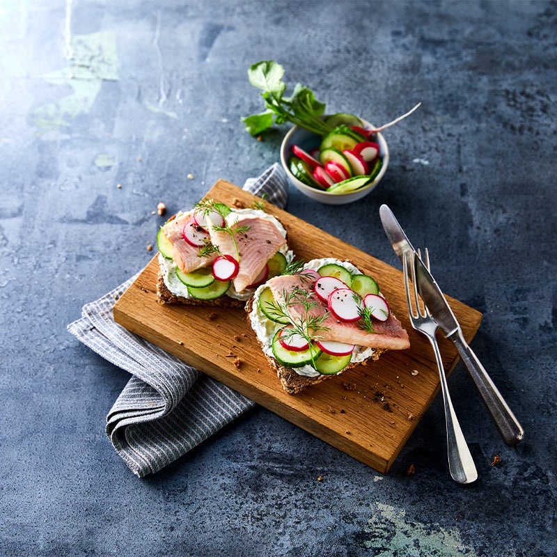 Schwarzbrot mit Meerrettich-Aufstrich bestreichen, mit Radieschen, Gurke und Forellenfilet belegen. Mit Dill würzen. Restliche Radieschen und Gurke dazu servieren.