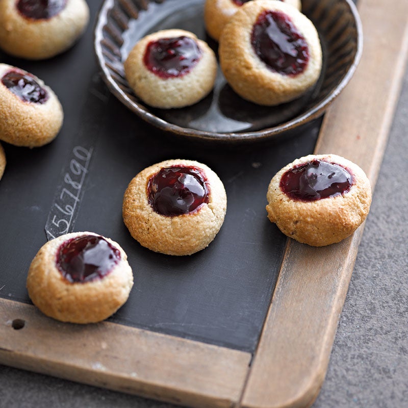 Aus der Masse mit feuchten Händen 16 Kugeln formen und auf einem mit Backpapier ausgelegten Backblech verteilen. Jeweils eine kleine Mulde in die Mitte drücken und etwas Konfitüre einfüllen. Amarettini im Backofen auf mittlerer Schiene ca. 20 Minuten backen und servieren.
