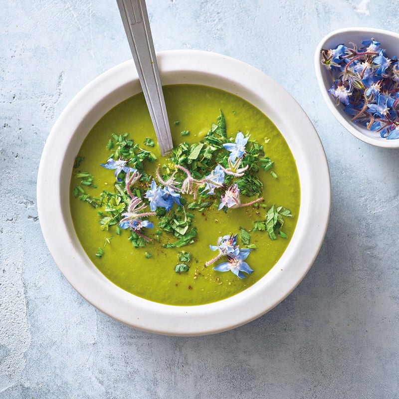 Kräuter waschen, trocken schütteln und grob hacken. 2 EL Kräuter beiseitestellen, restliche Kräuter zur Suppe geben, pürieren und mit Salz und Pfeffer abschmecken. Gartenkräutersuppe mit restlichen Kräutern und Borretschblüten garniert servieren.