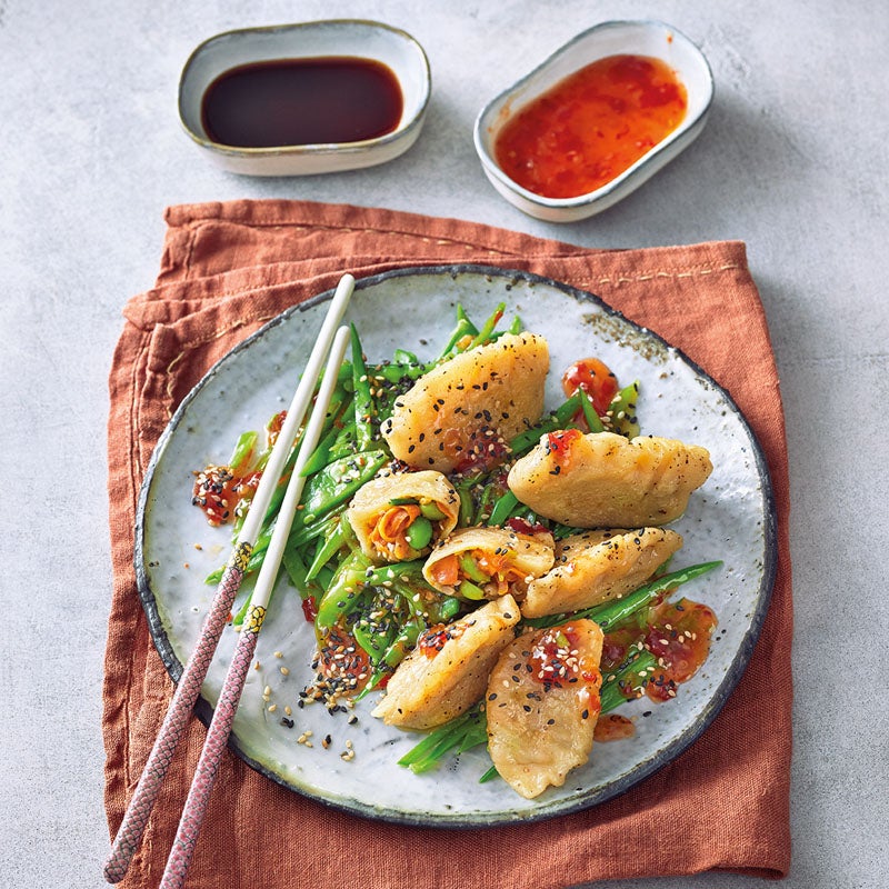 Restliches Öl in einer Pfanne auf mittlerer Stufe erhitzen und Gyoza darin 2–3 Minuten anbraten. Restliches Wasser angießen und mit Deckel 2–3 Minuten dämpfen. Gyoza mit restlichem Sesam bestreuen und mit Zuckererbsenschoten, restlicher Sojasauce und Asia-Chilisauce servieren.