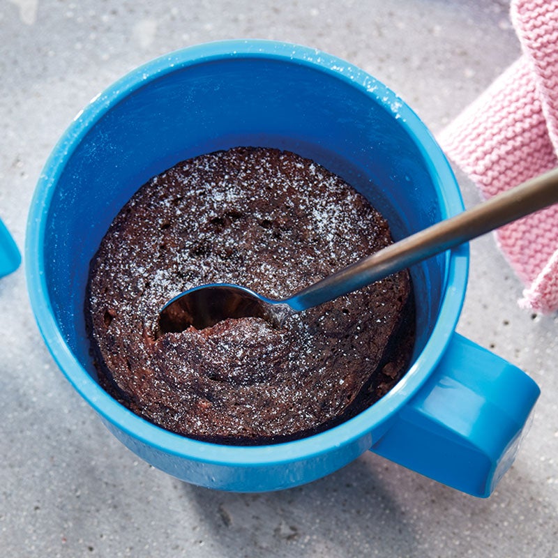 Teig in den Lunch to go Becher füllen, mit Deckel verschliessen und in der Mikrowelle bei 800 Watt 2–3 Minuten garen. Lunch-to- go-Cake mit Puderzucker bestäubt servieren.