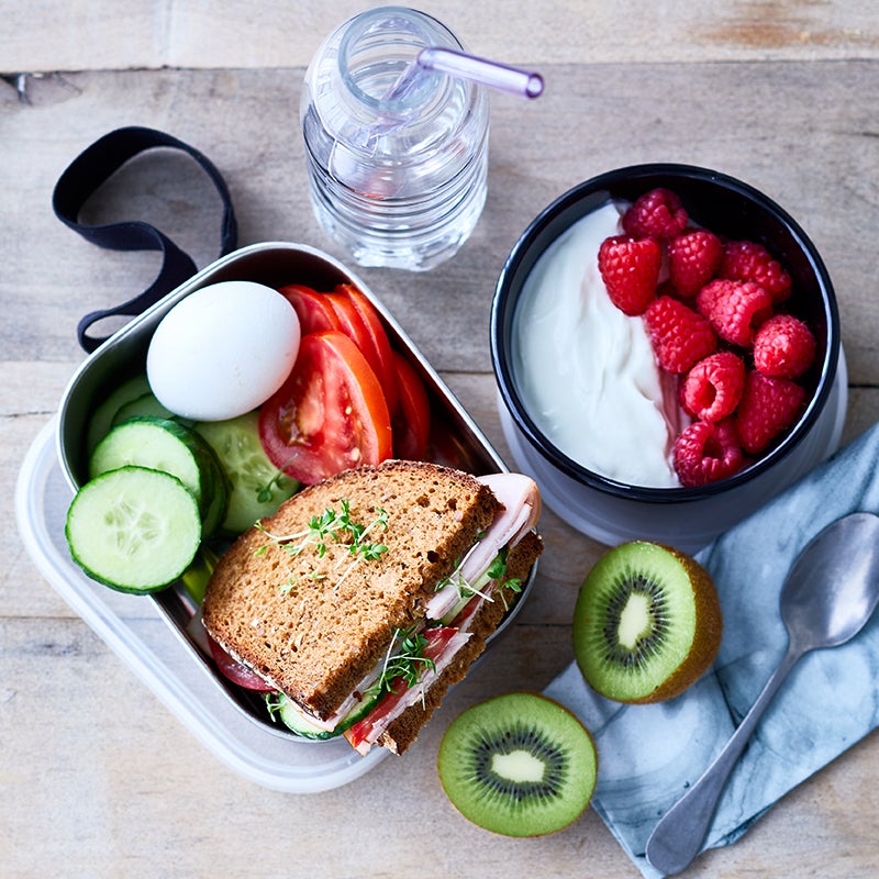 Ei, Kiwi, die restlichen Tomaten- und Gurkenscheiben sowie den Joghurt mit Beeren einpacken und alles in der Frühstückspause schmecken lassen!
