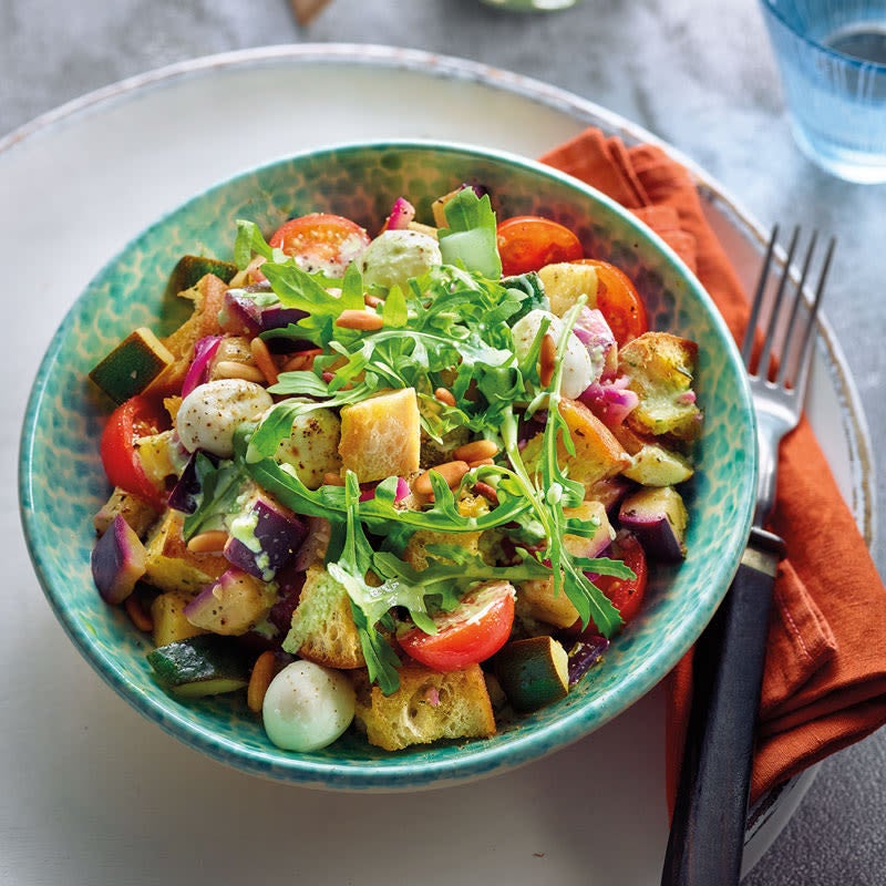 Für das Dressing Basilikum waschen, trocken schütteln und mit Bouillon, Joghurt, Parmesan, Salz und Pfeffer pürieren. Mozzarella-Minis trocken tupfen. Tomatenhälften mit Rucola, Gemüse, Mozzarella-Minis, Ciabattabrotwürfeln und Dressing vermischen und mit Salz und Pfeffer abschmecken. Mediterranen Brotsalat mit Pinienkernen bestreut servieren.