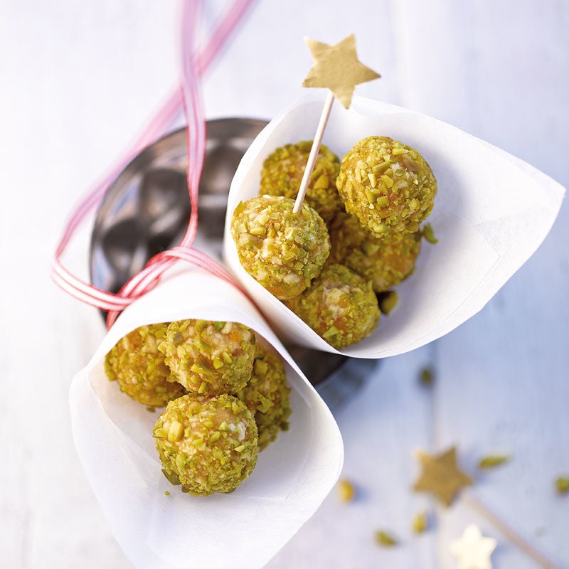 Pistazien fein hacken und auf einem tiefen Teller verteilen. Aus der Früchtemasse mit feuchten Händen 25 kleine Bällchen formen und in den Pistazien wälzen. Pistazienpralinen servieren.