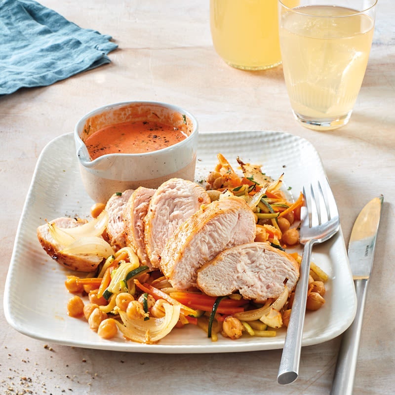 Poulet mit Ofengemüse und Peperonidip / Hähnchen mit Ofengemüse und Paprikadip