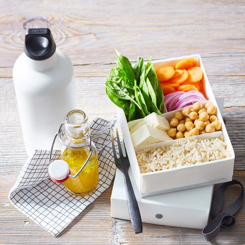 Reis, Karotten, Kichererbsen, Zwiebelringe, Spinat und Feta in einer Lunchbox anrichten. Dressing separat transportieren. Kurz vor dem Essen vermischen und geniessen.