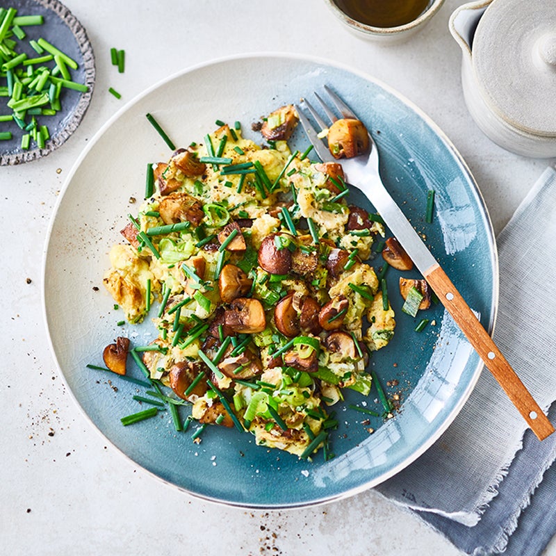 Eimasse zum Gemüse giessen und auf mittlerer Stufe unter Rühren ca. 5 Minuten stocken lassen. Mit restlichem Schnittlauch bestreut servieren.