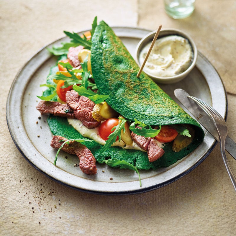 Pfannkuchen mit Creme bestreichen, jeweils mit Rucola, Gewürzgurkenscheiben, Tomatenhälften und Rindsfiletstreifen belegen, zusammenklappen und Spinat-Pfannkuchen servieren.