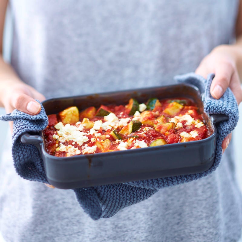 Backofen auf 200° C (Gas: Stufe 3, Umluft: 180° C) vorheizen. Zwiebel, Zucchini und Knoblauch würfeln. Olivenöl in einem Topf erhitzen und Gemüse darin andünsten. Tomaten dazugeben, mit Kräutern, Salz und Pfeffer abschmecken und ca. 5 Minuten köcheln. Alles in eine Auflaufform geben. Feta darüberkrümeln und auf mittlerer Schiene ca. 15 Minuten überbacken.