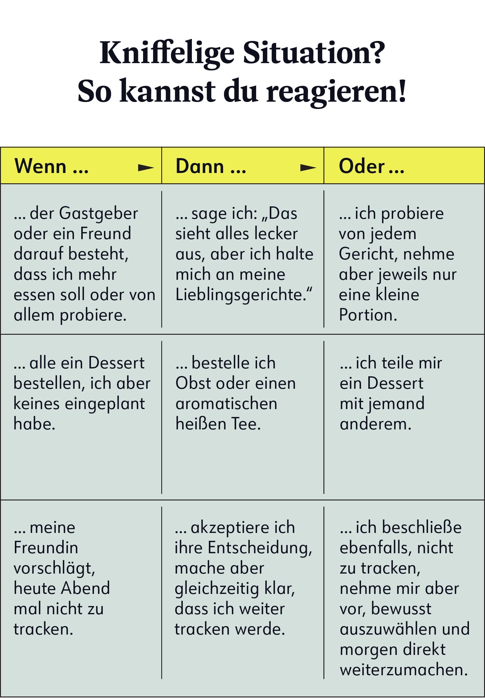 Doch natürlich kannst du nicht alles kontrollieren und du musst auch nicht perfekt sein – schließlich möchtest du dich amüsieren. Es ist also völlig in Ordnung, wenn du mehr isst als geplant, weil die Häppchen so lecker sind. Oder doch in den Brotkorb greifst, weil das Gebäck noch warm ist und so verführerisch riecht, obwohl du das nicht tun wolltest. Das ist dann die Gelegenheit, die Weichen für den Abend neu zu stellen und mithilfe deiner vorher gemachten Aktionspläne wieder in die Spur zu kommen.