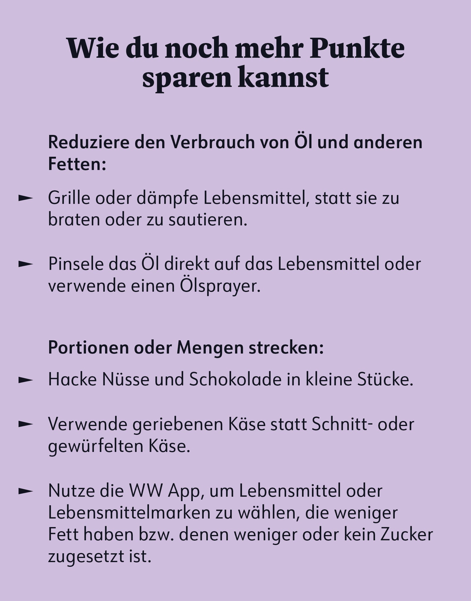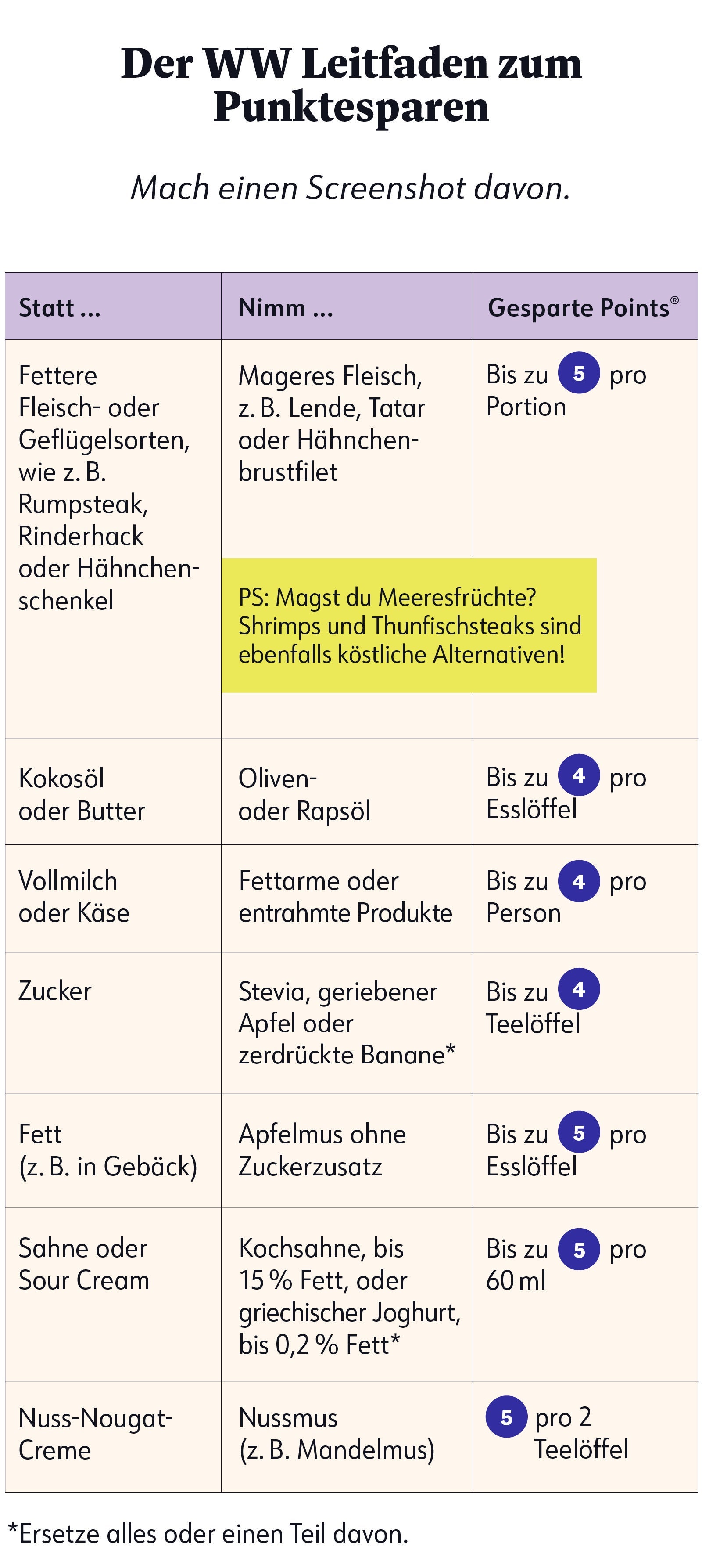 Denk an die Rezepte, die du gern magst oder die du diese Woche zubereiten willst. Wie wäre es, wenn du einige Points® einfach verschwinden lassen könntest? Dieser praktische Leitfaden macht es möglich. Wenn du ein paar Zutaten in deinen eigenen Rezepten ersetzt, kannst du sie ganz leicht „schlank kochen“.