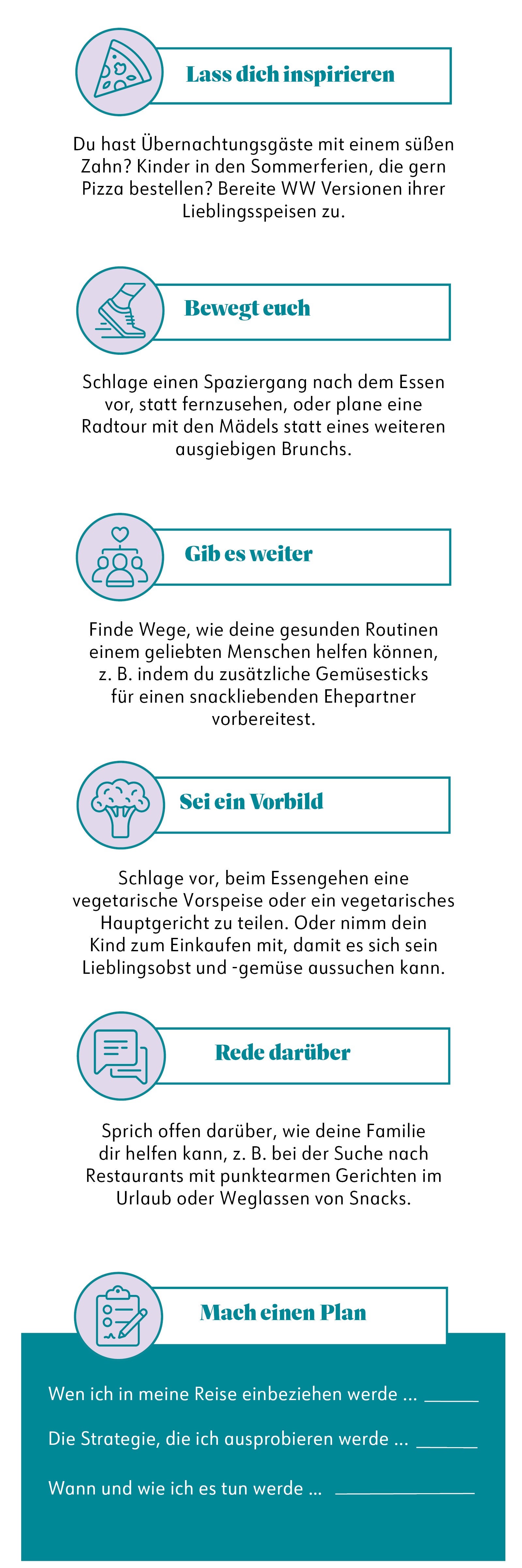 Anstatt aufzugeben, suche nach einer Lösung: Beziehe deine Mitmenschen in deine Reise mit ein, während du dich an die neuen oder vorübergehenden Umstände anpasst. Studien zeigen, dass diejenigen, die von Freunden und Familie am meisten unterstützt werden, mehr Gewicht verlieren. Du kannst zwar nicht kontrollieren, was andere tun, aber die Chancen stehen gut, dass sie dir helfen wollen – du musst ihnen nur zeigen, wie.