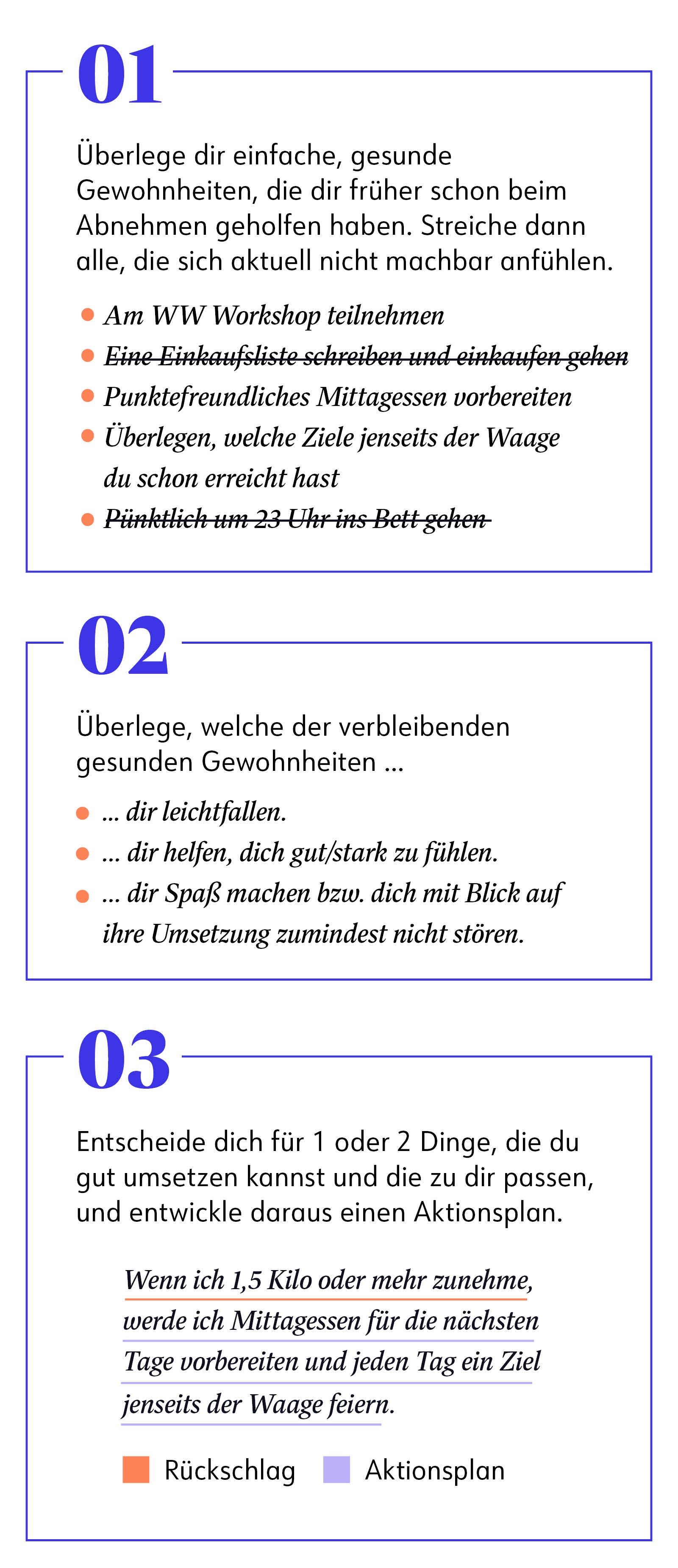 Egal, ob du zugenommen hast, dein Points® Budget überzogen hast oder irgendwie anders aus dem Tritt geraten bist: Mach dir bewusst, dass das jedem auf dem Weg zum Wunschgewicht mal passiert. Und dann setzt du deinen Aktionsplan für solche Fälle um. Du hast noch keinen? Dann lass uns das ändern.