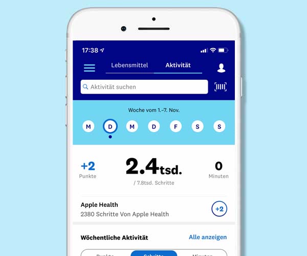 Entdecke neue Workouts für deine Bewegungsroutine, gehe eine Runde um den Block oder mach den wöchentlichen Hausputz. Jeede Bewegung zählt! Mit einem Fitness-Tracker lassen sich deine Aktivitätsdaten automatisch erfassen, sodass du auch automatisch Punkte dazu verdienen kannst. Im Tagebuch kannst du nachschauen, wie viele Minuten du dich bewegt hast oder wie viele Schritte du gegangen bist.