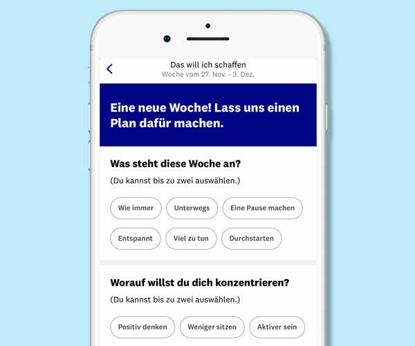 Wir unterstützen dich, für die nächste Woche ein passendes Ziel zu definieren, indem wir dir für dich passende Möglichkeiten vorschlagen. Der Plan soll nur dir allein eine Hilfestellung sein, deine Ziele im Blick zu behalten.