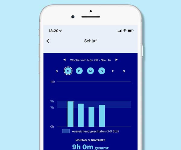 Mit Hilfe des Schlaf-Trackers kannst du nachvollziehen, was deine Schlafgewohnheiten beeinflusst und wie du deine Routinen anpassen kannst. Wir geben dir außerdem Tipps an die Hand, wie du z. B. auch bei Stress erholsamer schlafen kannst.