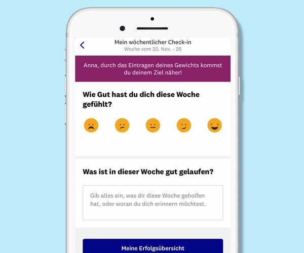Die Zahl auf der Waage ist nicht alles. Für ein ganzheitliches Bild über dein Wohlbefinden und deiner Fortschritte fragen wir dich regelmäßig danach, wie du dich in der Vorwoche gefühlt hast und was gut funktioniert hat. Der Check-in ist jedoch kein Muss! Du entscheidest, ob überhaupt und wann du einen Check-in machst. Denn er dient immerhin dazu, dass du dich und dein Wohlbefinden nicht aus den Augen verlierst.