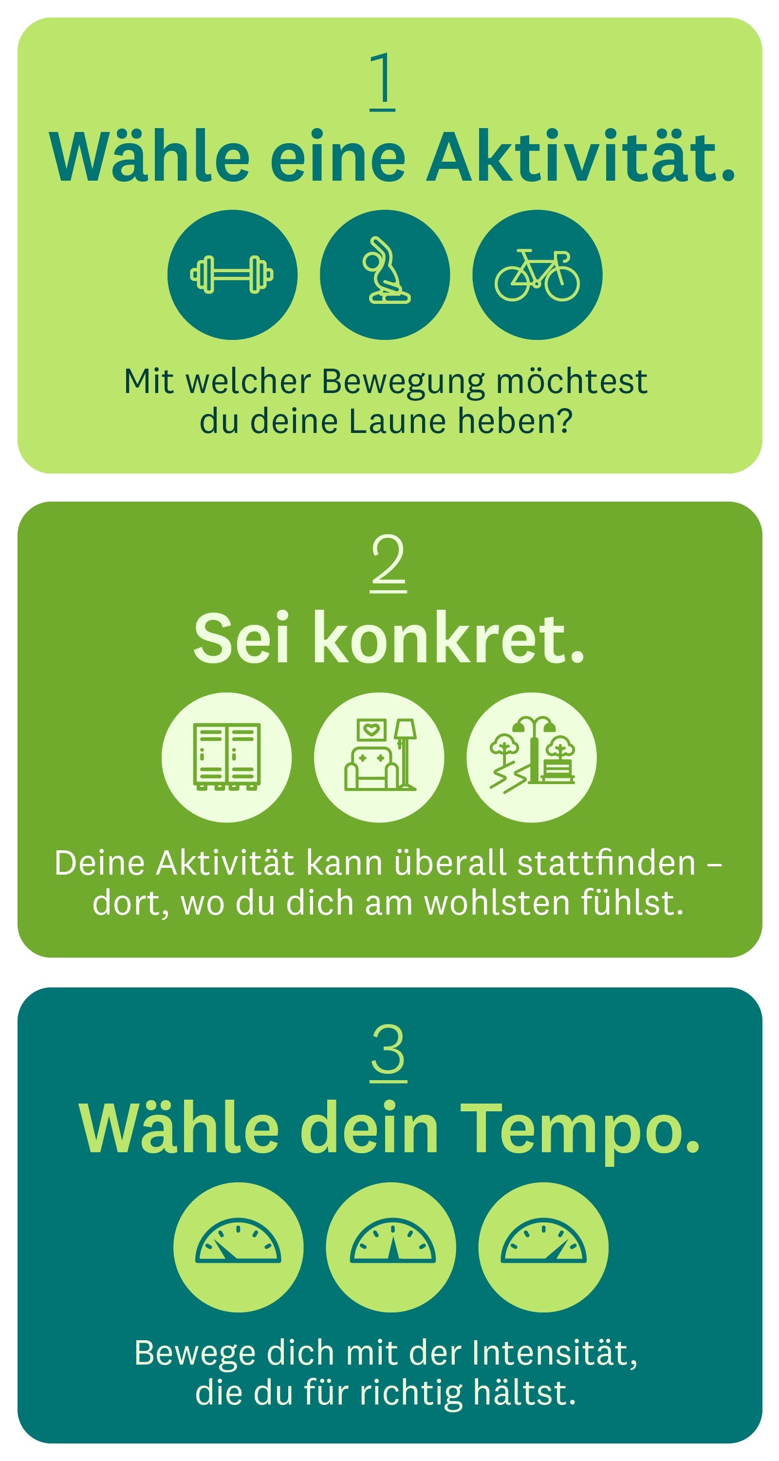 Mit den folgenden Schritten findest du eine Aktivität, die deine Stimmung verbessern kann. Plane dann, wo und wann du diese Aktivität ausführen wirst.