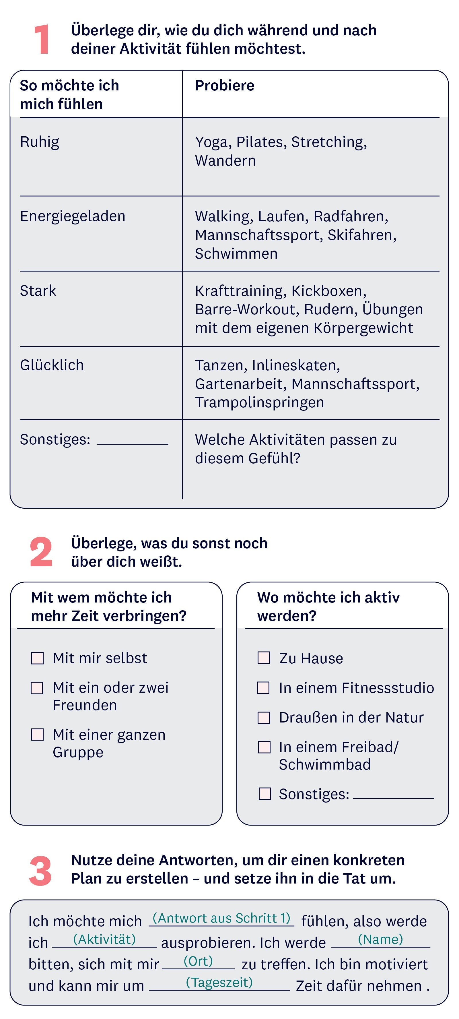 Warst du schon mal spazieren? Einfach so, zum Spaß? Und nicht weil du weißt, dass Bewegung gut für dich ist? Hast du gespürt, wie wohl du dich währenddessen gefühlt hast? Oder hast du schon mal bemerkt, wie sich dein ganzer Körper entspannt, während du zu deinem Lieblingssong tanzt? Vielleicht gehören diese Dinge schon zu deiner Bewegungsroutine – eben weil sie dir Spaß machen. Doch was, wenn dir die Lust darauf nach einiger Zeit vergeht oder du einfach mal was Neues ausprobieren möchtest? Dann orientiere dich unbedingt daran, wie du dich fühlen möchtest.