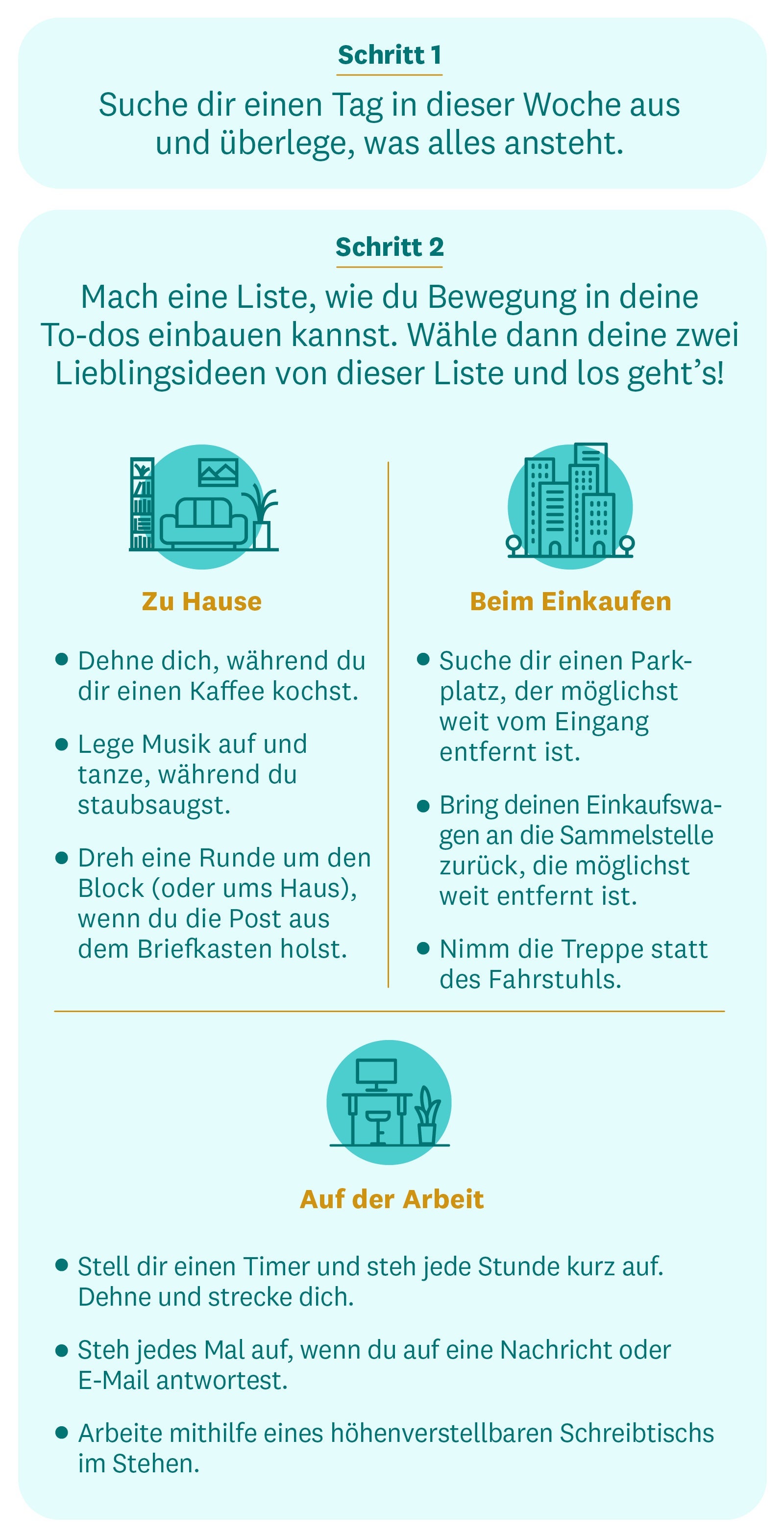 Kennst du die „Zu-zu-Krankheit“? Keine Zeit für Sport, da zu müde, zu kalt, zu viel im Job zu tun, zu viele Termine mit den Kindern … Wir zeigen dir, welche Möglichkeiten du hast, dich dennoch zu bewegen. Gestalte deinen Tag aktiver, indem du kleine Bewegungseinheiten mit Dingen kombinierst, die du sowieso machst. Denn jeder Schritt, jede Minute, jede Übung zählt und wirkt sich positiv auf dein Wohlbefinden und deine Gesundheit aus.