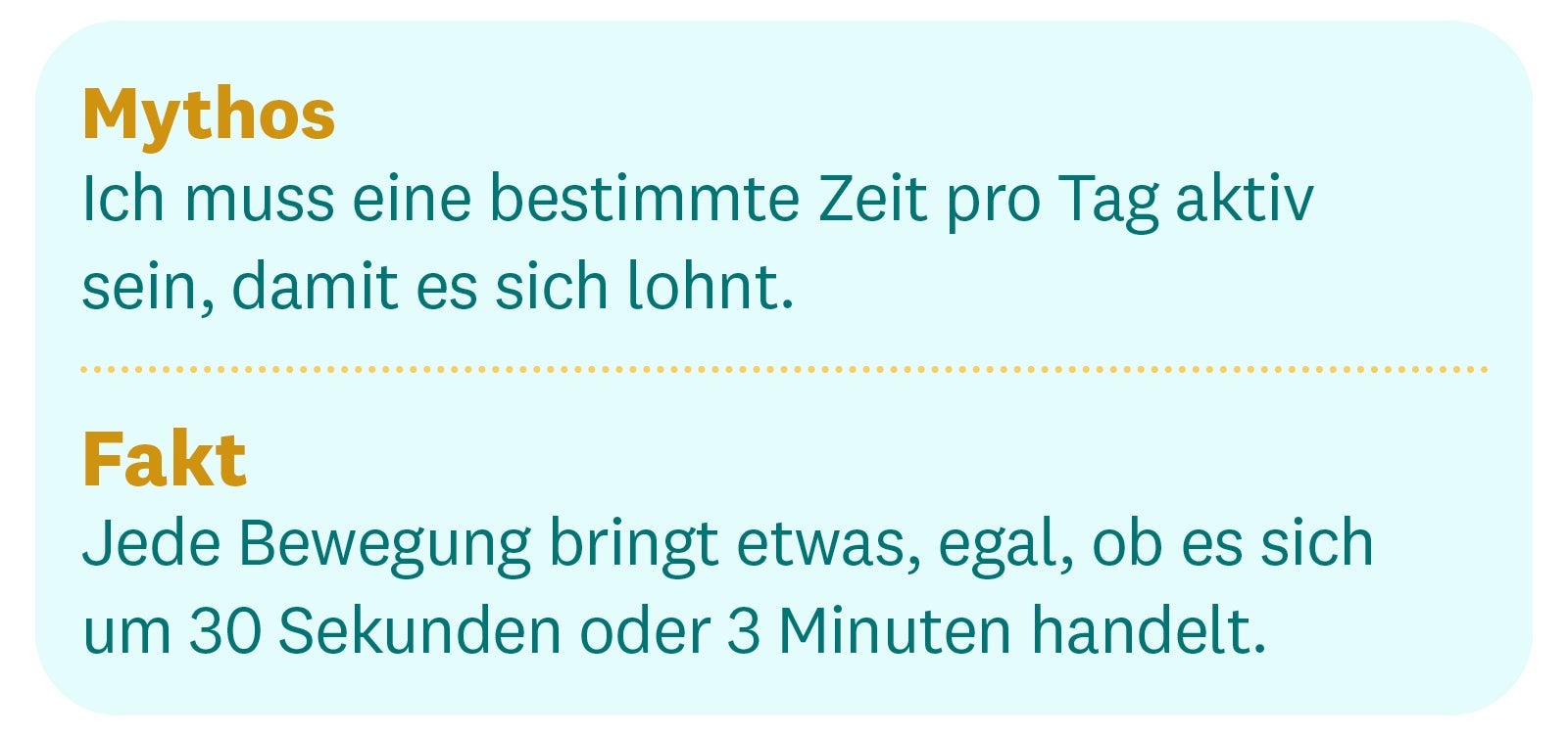 Wenn es um Sport geht, ist oft die sogenannte Alles-oder-nichts-Mentalität zu beobachten. Wenn ich es nicht schaffe, 30 Minuten oder länger zu trainieren, kann ich es auch gleich bleiben lassen. Doch ein bisschen Bewegung ist besser als keine. Jede Kleinigkeit wirkt sich positiv auf deine Gesundheit und dein Wohlbefinden aus.