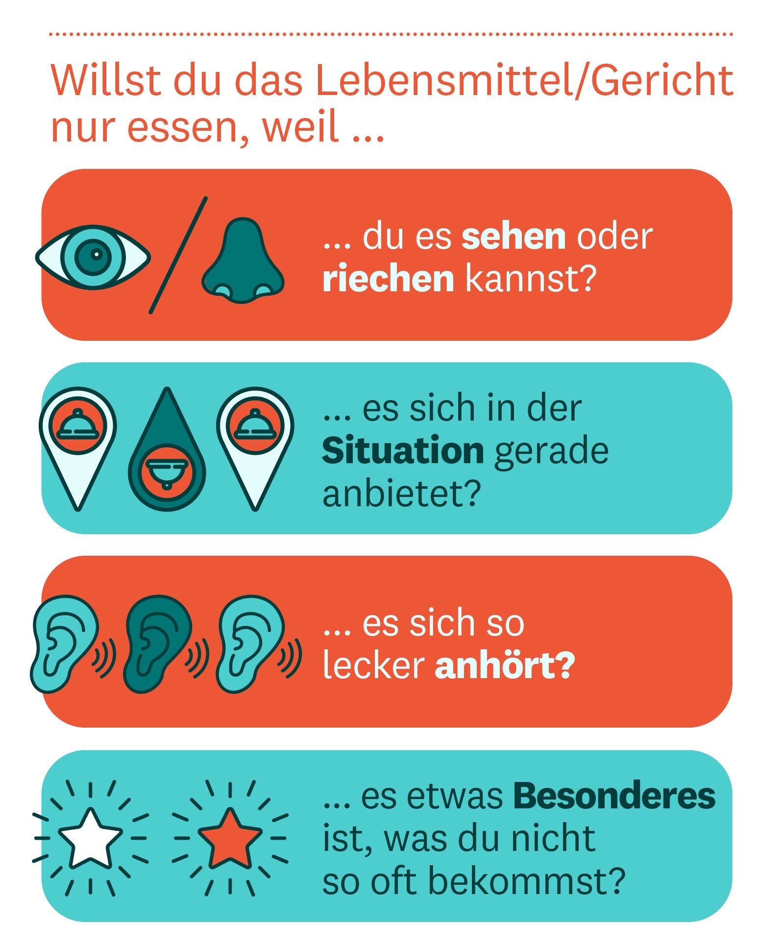 Wenn du eine dieser Fragen mit „Ja“ beantwortet hast, nimm dir einen Moment Zeit, um dir deine Gründe bewusst zu machen, warum du etwas essen möchtest und was du als Nächstes tun wirst.