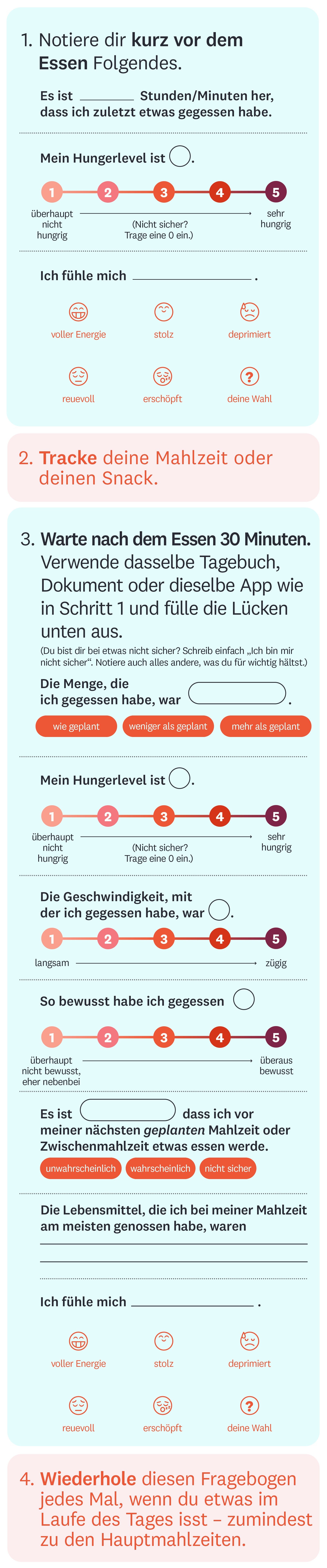 Suche dir drei Tage in dieser Woche aus, an denen du notierst, WIE und WAS du isst – und wie sich das auf dich auswirkt. Gehe dabei folgendermaßen vor.