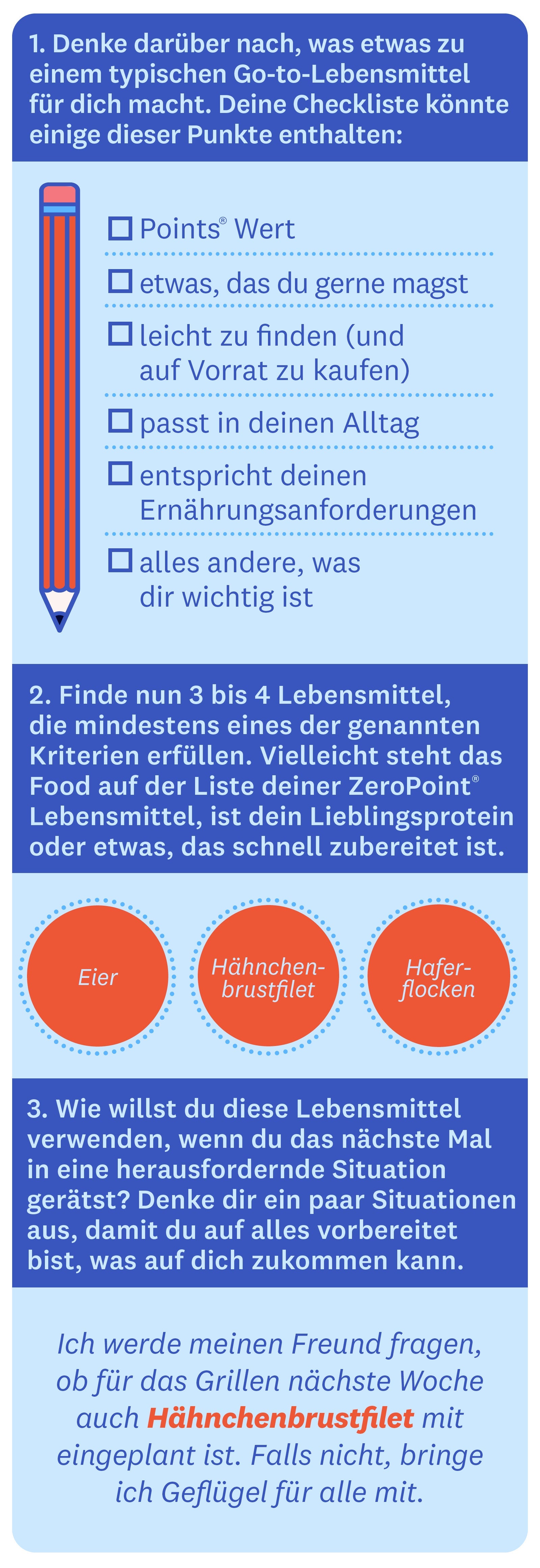 Stell dir deine Go-tos wie den Regenschirm vor, den du im Kofferraum deines Autos hast. Klar, ein überraschender Regenschauer ist nicht gerade lustig, aber weil du einen Regenschirm zur Hand hast, machst du dir wahrscheinlich nicht so viele Gedanken darüber. Das Gleiche gilt für diese Lebensmittel und Zeiten, in denen es etwas stürmisch werden könnte – vielleicht gehen dir die Points® aus, du bestellst in einem Restaurant etwas, das du nicht eingeplant hast, oder du hast einfach nur Hunger zwischen den geplanten Mahlzeiten. Ganz gleich, wo du dich auf deiner Reise befindest, betrachte deine Lieblingsspeisen als Anker, die dich auf dem Weg zu deinen Zielen begleiten.