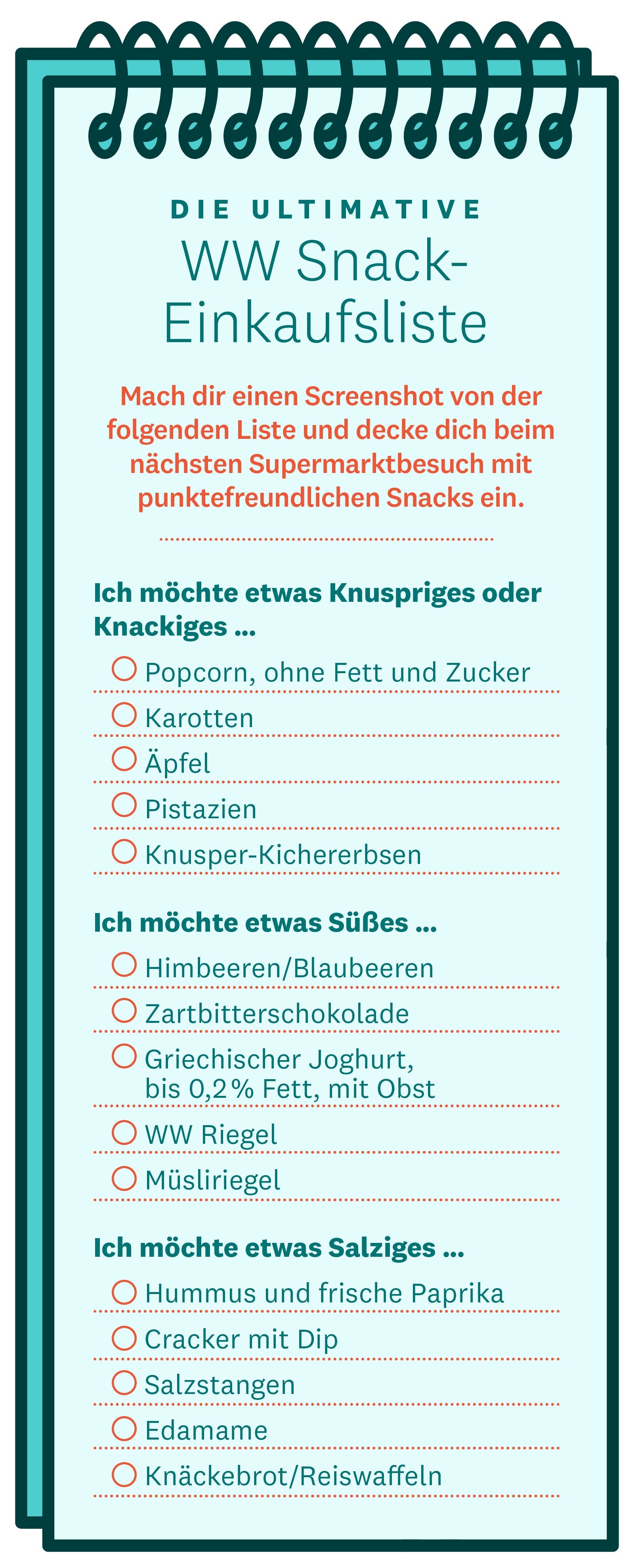 Du wirst plötzlich hungrig und weißt nicht, wie viele Punkte der Snack hat, den du dir ausgesucht hast? Dann kommt unsere Einkaufsliste gerade recht. Denn hast du immer etwas Punktefreundliches griffbereit, fällt es dir leichter, auf Kurs zu bleiben, wenn der kleine Hunger kommt.