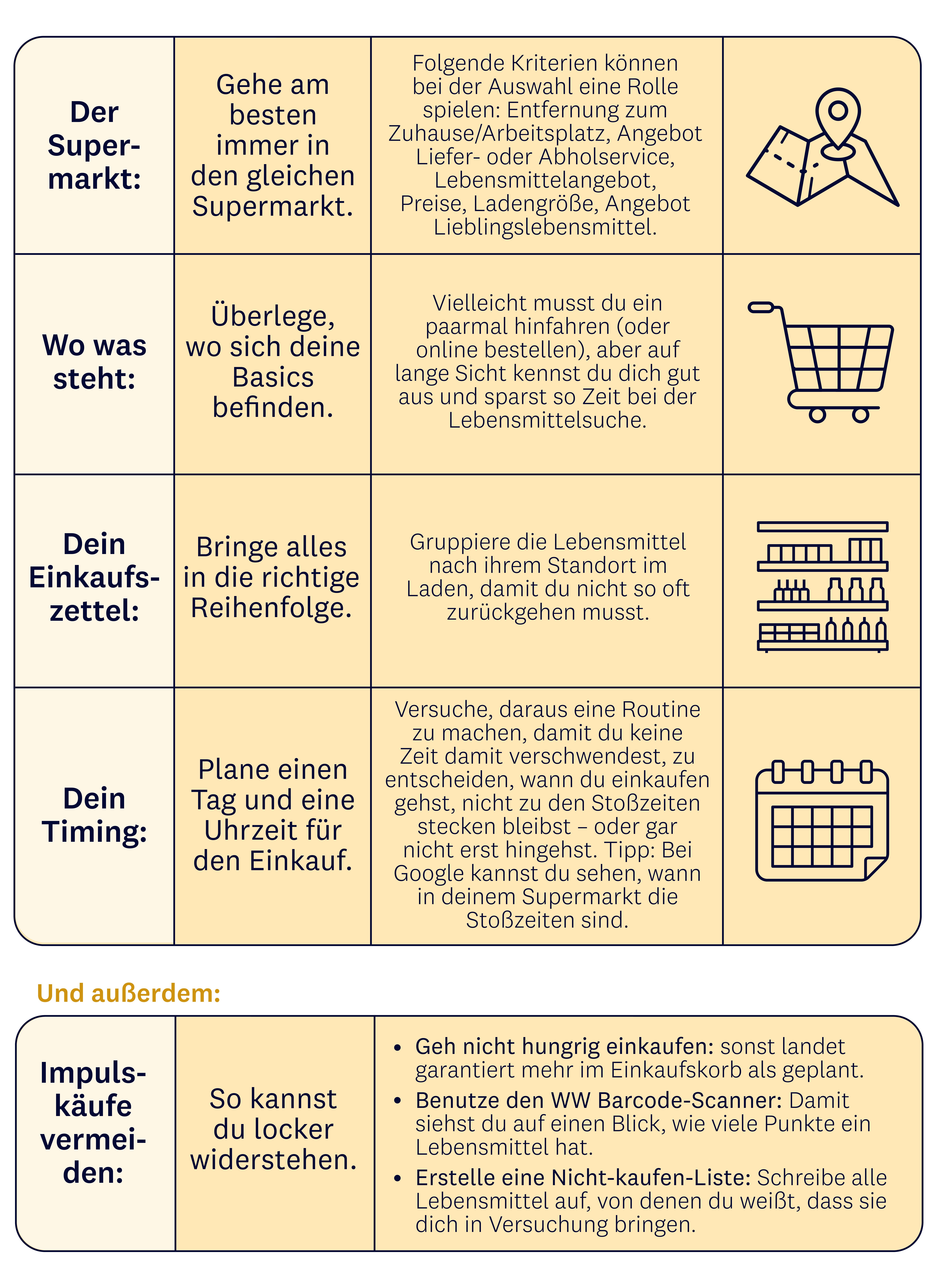 Wenn du ein bisschen Zeit in Planung und Strategie deines Einkaufs investierst und ihn zu einer wöchentlichen Gewohnheit machst, kannst du Zeit und Points® sparen und bist weniger gestresst. Und: Wenn du deine Küche mit ZeroPoint® Lebensmitteln, günstigen Basislebensmitteln und deinen Lieblingszutaten bevorratest, fällt es dir leichter, gesunde Entscheidungen zu treffen und auf dem richtigen Weg zu bleiben.
