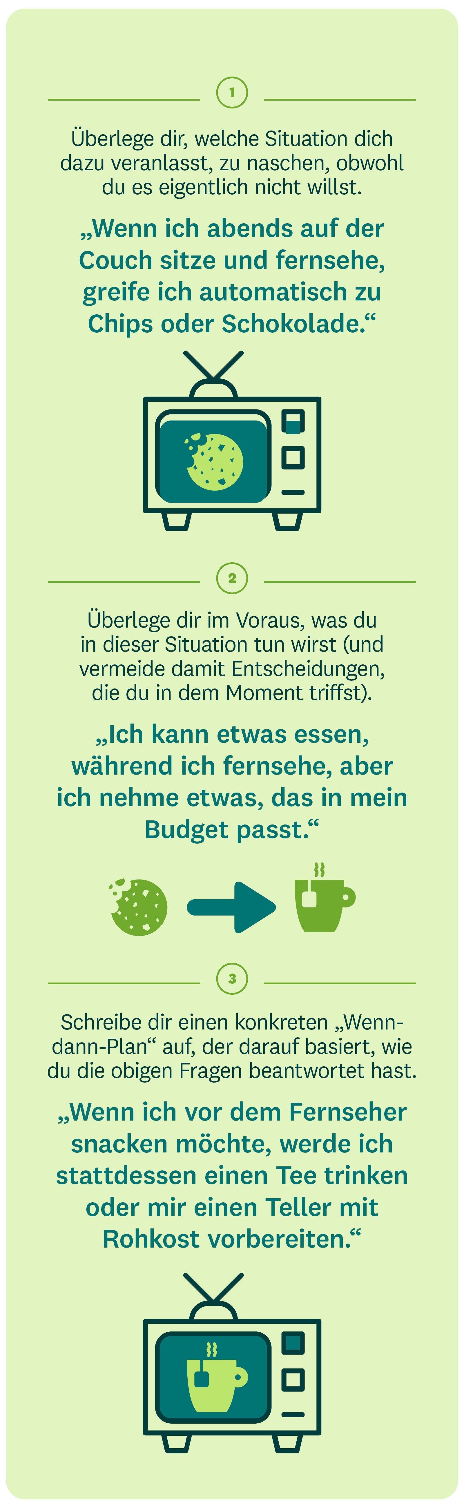 Nächtliches Essen ist nur ein Beispiel, aber es kann genauso hilfreich sein, sich für andere Bereiche des Lebens „Wenn-dann-Pläne” zu überlegen. Probier’s z. B. aus, wenn du beim Einkaufen den Gang mit der Eiscreme meiden willst, oder versuche, beim Gedanken „Nur noch eine Episode” Nein zu sagen und früh ins Bett zu gehen.