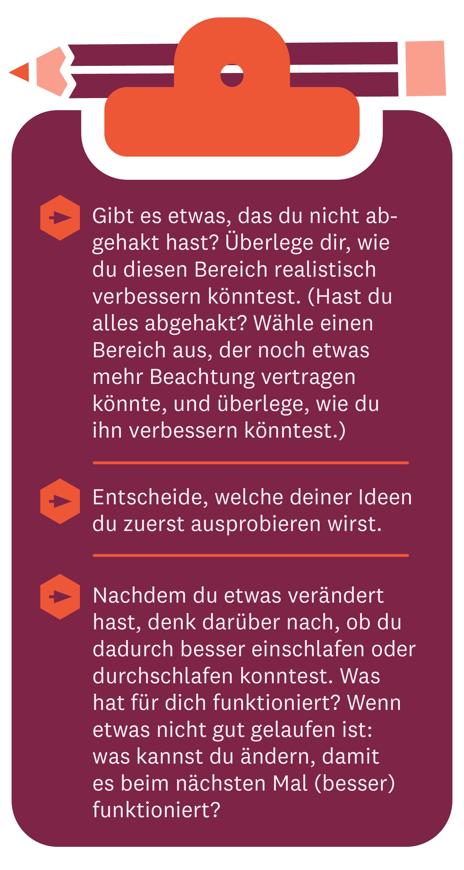 Du kannst vielleicht nicht alles an deiner Schlafumgebung beeinflussen (z. B. die laute Straße, an der du wohnst, der schnarchende Partner, die nichtdurchschlafenden Kinder oder die längeren Tage im Sommer) – das ist aber in Ordnung. Beginne mit einem Bereich und konzentriere dich auf diesen einzelnen Punkt, den du verändern kannst.