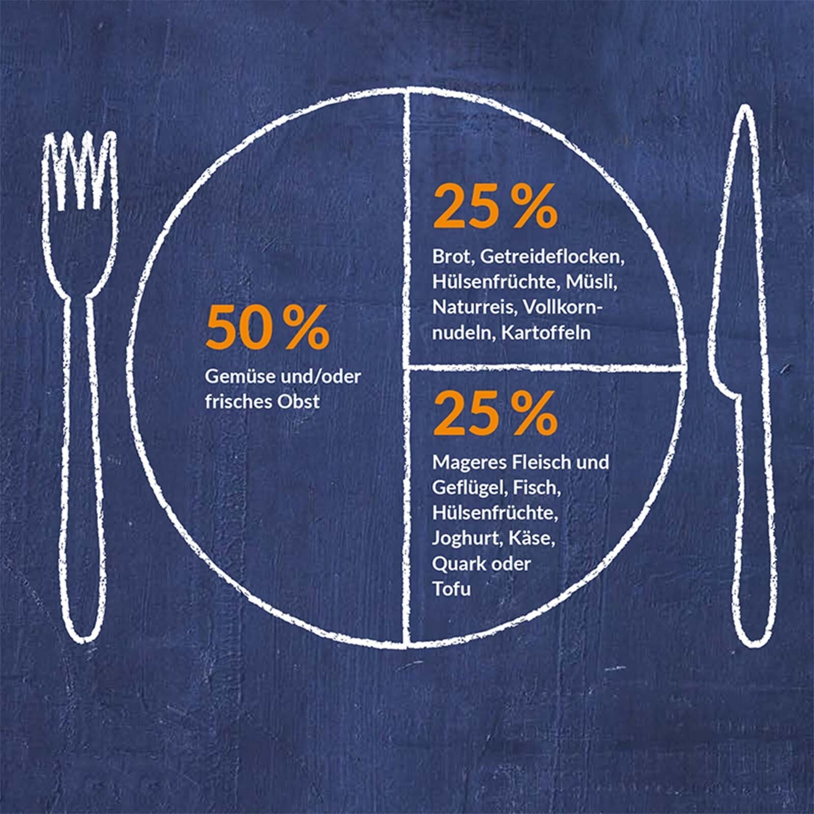 Es kommt nämlich nicht nur darauf an, was du isst, sondern auch, wie viel bzw. in welchem Verhältnis die Lebensmittel zueinander stehen. Natürlich wollen wir daraus keine Wissenschaft machen. Um es kurz zu machen: Die 50-25-25-Regel bietet eine gute Orientierung.