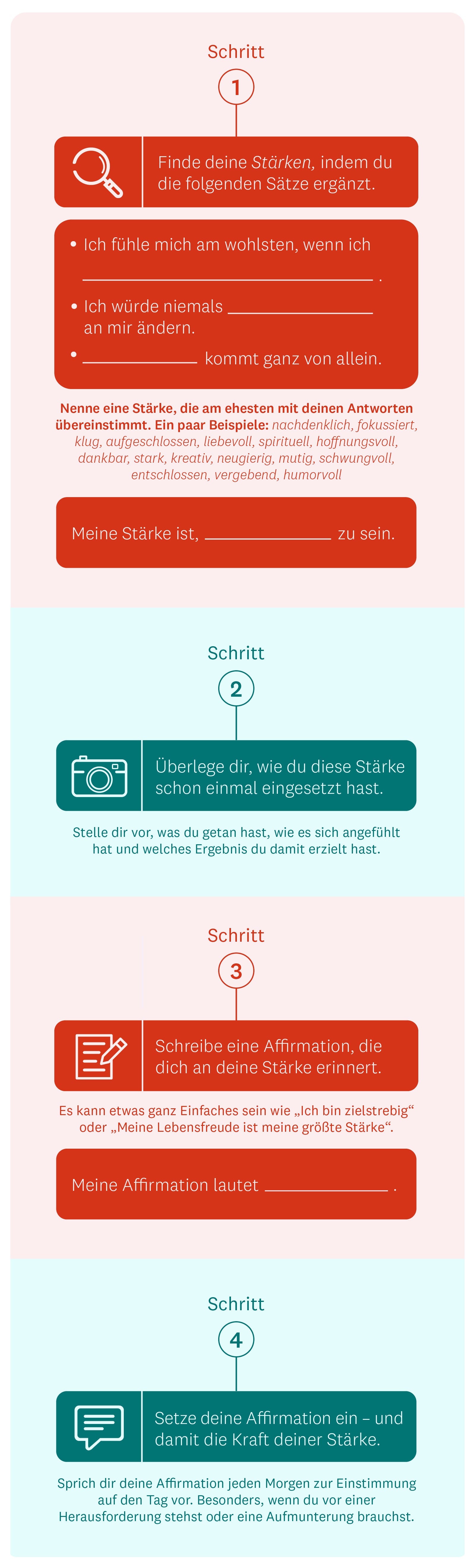 Wenn wir unsere Stärken erkennen und uns an sie erinnern, kann dies unsere Selbstwirksamkeit erhöhen. Das heißt unser Vertrauen in unsere Fähigkeit, etwas zu erreichen oder eine neue Fähigkeit zu entwickeln.1