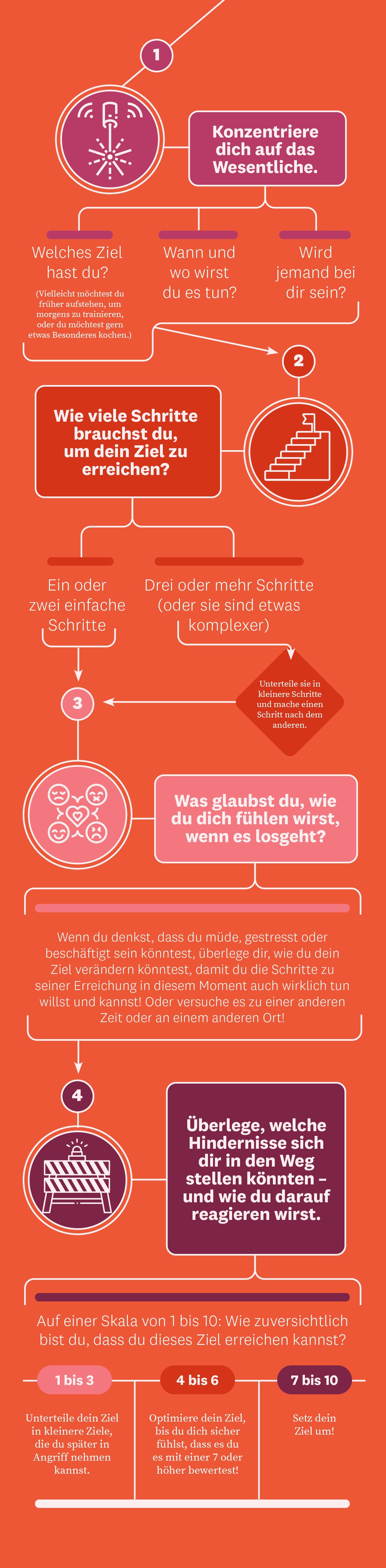 Wenn du ein Ziel in ein paar praktische Schritte aufteilst, ist es wahrscheinlicher, dass du es erreichen wirst. Dabei kann es dir helfen, dir vorzustellen, wie du dich in dem Moment fühlen wirst, in dem du dein Ziel erreichst, aber auch wie du auf eventuelle Hindernisse reagieren wirst.