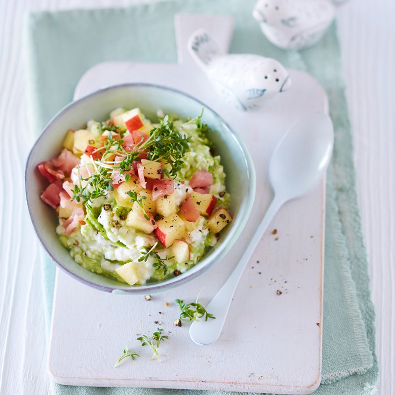 Apfel würfeln und mit Zitronensaft beträufeln. Lachsschinken ebenfalls würfeln. Avocadofruchtfleisch mit einer Gabel zerdrücken. Hüttenkäse unterrühren. Kresseblättchen mit einer Schere von den Stielen schneiden und mit Apfel und Schinken zum Hüttenkäse geben, salzen, pfeffern und servieren.