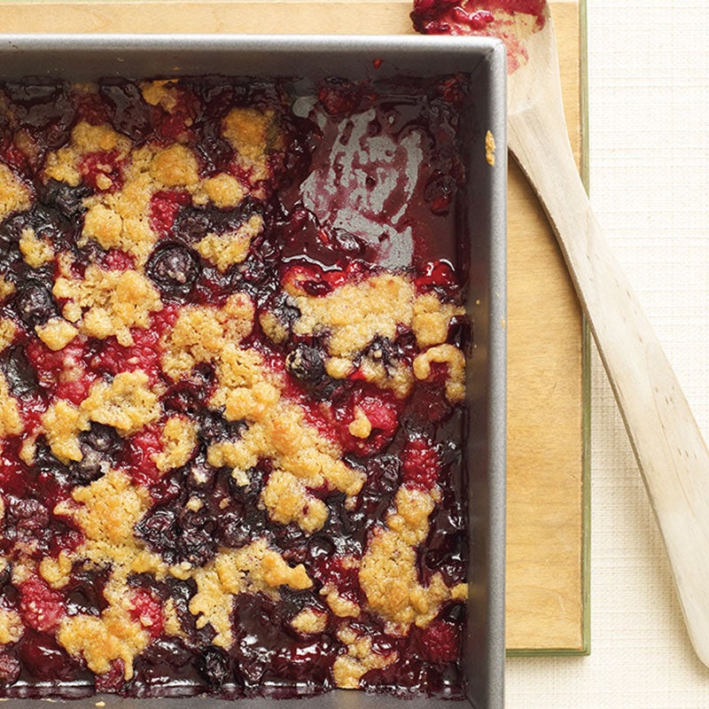 Backofen auf 180° C (Gas: Stufe 2, Umluft: 160° C) vorheizen. Beeren waschen, trocken tupfen und in einer Auflaufform (ca. 20 x 20 cm) verteilen. 2 EL Mehl mit 1 EL Zucker vermischen und unter die Beeren heben.