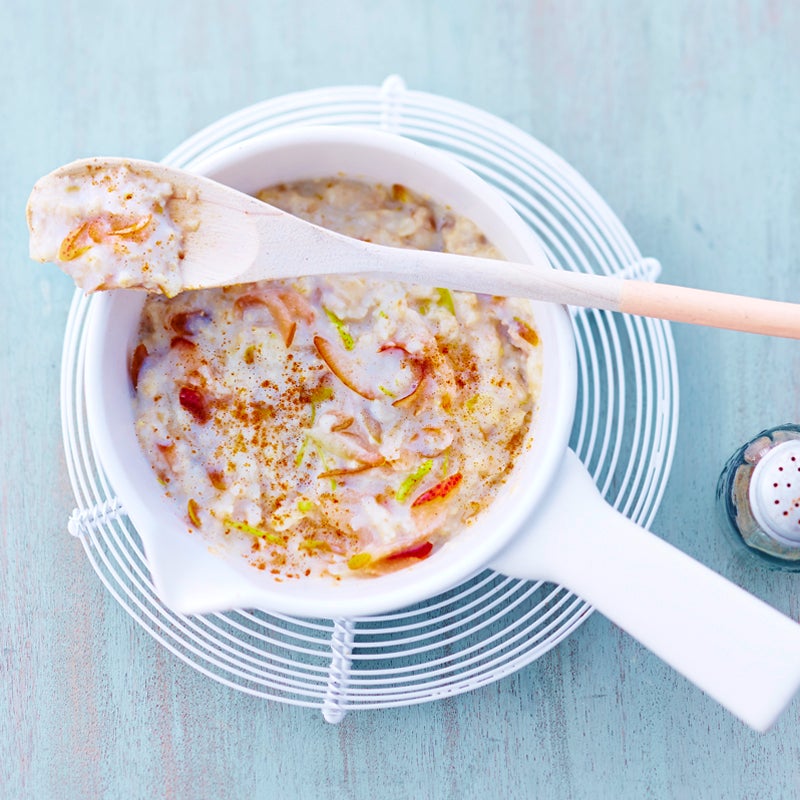 Birne raspeln. Milch mit Haferflocken und Birnenraspeln aufkochen. Porridge 7 Minuten köcheln lassen, mit Honig und Zimtpulver verfeinern.
