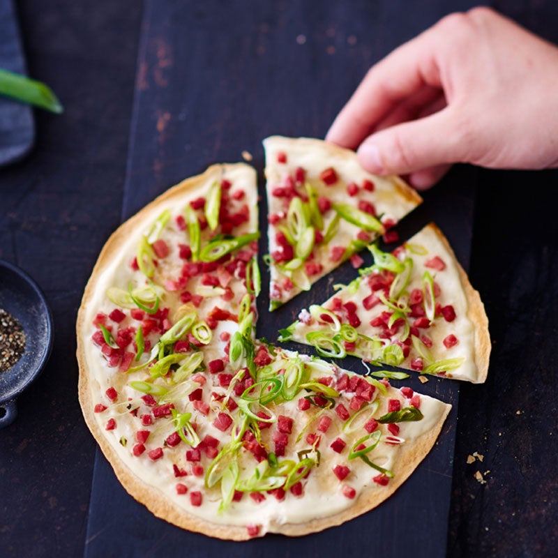 Flammkuchen im Backofen auf mittlerer Schiene ca. 10 Minuten backen.
